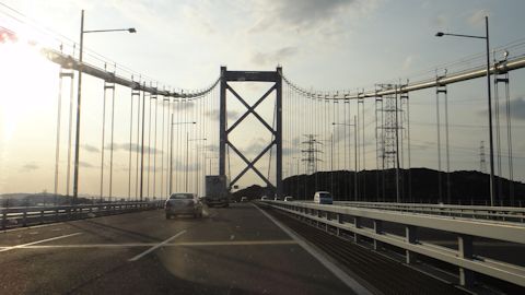 小倉東ICから高速に乗る。夏の残日が傾きかけている。関門海峡を渡り再び本州に戻る。中国自動車道に入り、山口県のサービスエリアで山口土産、夏みかん饅頭を買う。日は沈んだ。広島県、岡山県を縦断。ひたすら東へ走る。兵庫県に入ったところにある上月サービスエリアで夕食。ラーメンライス。時刻は午後10時半。