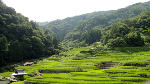国道187号を北上、ほどなく島根県に入る。いい天気だ。途中、大井谷という山あいの小村に、日本100選の棚田を見に行く。棚田と山の斜面に立つ家々が、これが日本の風景だとなぜか懐かしい感じがする。フィリピンのバナウェで見た壮大なすり鉢に形成された棚田とはちと違うが、家と棚田がコンビとなって風景を構成している点は同じだ。