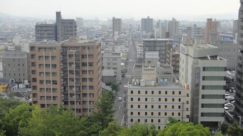 さて、登城道を登り、松山城の天守閣にたどり着く。松山城のキャラクターは「よしあきくん」というが(加藤嘉明のことだろう)、人気は出そうもない。天守に登ると、松山の街がかなり大きいことが実感できる。さすが四国有数の都市だ。遠くに瀬戸内海が見渡せる。