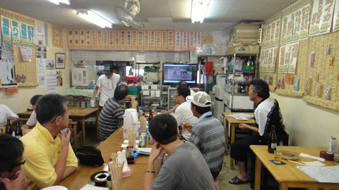 3軒並んだ競馬新聞売り場。どれがいいか分からなかったので、適当に選ぶ。「キンキ」という新聞、550円。腹が減っていたので、数軒並んでいる食堂のうちの一つに入る。中は涼しい。常連的なオヤジ連中が、店の中のテレビで観戦している。すぐそこにパドックがあるのに、涼しい店内で一杯やりながらテレビを見て予想するのだ。なるほどね。