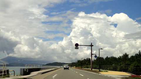 高知市街に戻る土佐湾沿いの道は、光を反射する海の藍、突き抜けるような空の青、グングンと湧き上がった雲の白。鮮やかなコントラスト。