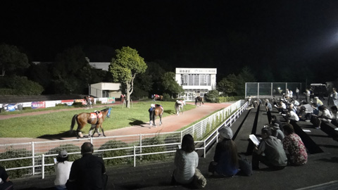 そんな中でも、光に照らされたパドックは、さみしさよりも暖かい感じがする。ライトの中、馬と引き手が黙々と歩く。少ないながらも、観客は石段に腰を下ろして、ゆったりと馬を眺めている。この緩さはいいなぁ。常連だろう、おじさんたちは元気だ。声を張り上げて馬や騎手の悪口やほめ言葉や冗談を言い合っている。この常連のおじさんたちが集まる感じは、地方競馬場の風景だろう。数は少ないがカップルもいる。