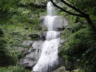 11号線から国道494号へさらに山の中へ。雨は降ったり止んだり。石垣を積んだ棚田、山間に点在する集落、古めかしい木造家屋。日本の原風景がここにもある。また戻ってきた。黒森峠に登るつづら折れの道路の途中、唐岬の滝(からかいのたき)という看板を発見。ここに、夏目漱石や正岡子規といった松山ゆかりの文人たちも訪れたという滝があるそうだ。僕は車を降りて見に行くことにした。しばらく山道を歩く。林を通り過ぎると、背丈1メートルくらいもある草が生える草地へ。廃車が1台、草の中、丘の斜面に放置されている。さらに草道を降りる。再び林に入り、川の音が聞こえてくる。20分ほど歩いて、ついに唐岬の滝にたどり着く。黒光りする岩壁を5段に分かれて水が流れ落ちる。なるほど、爽快だ。