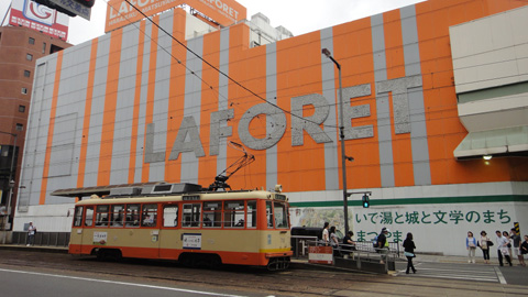 ラフォーレの壁には大きな文字で「いで湯と文学のまち、まつやま」という文字が刻まれている。確かにそうだ。が初めてここを訪れた僕が思うのは、こうだ。