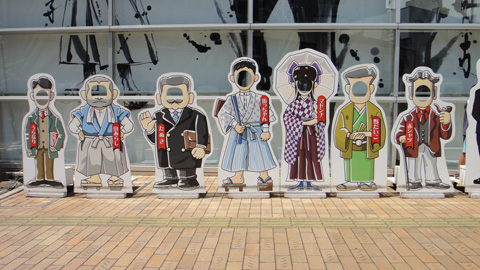 ロープウェイ乗り場には、『坊ちゃん』の登場人物や『坂の上の雲』の主人公達の顔くりぬきボードがあり、子供達が裏から顔をのぞかせて親が記念写真を撮っている。