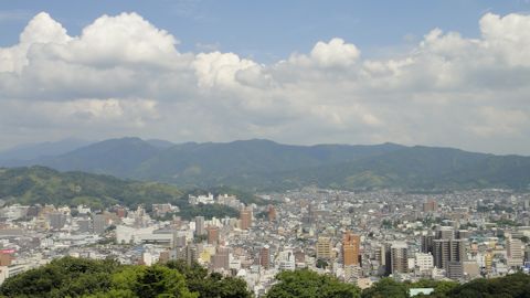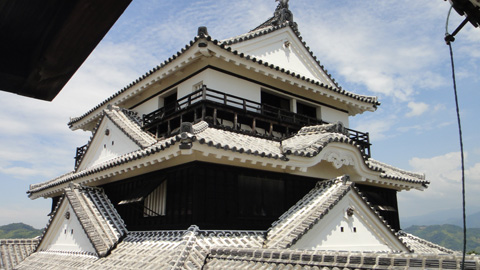 一人乗りリフトまたはロープウェイで広大な松山城公園のいいところ(8合目)まで上がる。そこからは松山城までの登城道で歩いて10分。松山城は標高132mの勝山山頂に加藤嘉明が築いた名城である。現在の天守は1854年に再建されたもので、国内現存12天守のうちの一つ。
