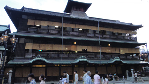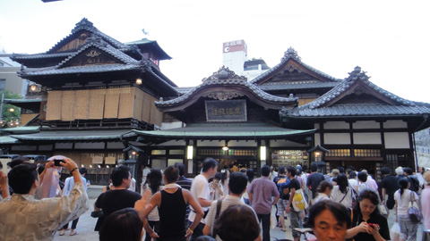 道後温泉本館は、アーケードの出口前に堂々と鎮座する、木造の公衆浴場である。百十年以上前に立てられた、国の重要文化財。入り口両側に木造建築が展開し、そこにはたくさんの浴場と畳の大広間があり、湯とお茶で休憩が楽しめる。『千と千尋の神隠し』に登場する湯屋のモデルとなったといわれることに納得する。