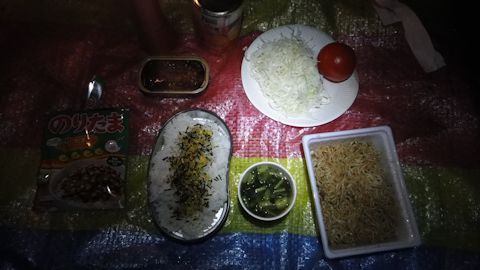 その後夕食。日は完全に暮れた。コンロに火をつけ、飯を炊く。キャベツ、トマト、ぺヤングソース焼きそば、ふりかけご飯、さんま蒲焼(缶詰)、味噌汁の豪華夕食。夕食を終えると、再びテントの中。あとは眠くなるまで本を読み、ラジオを聴くだけだ。夜になってAMラジオも大分入るようになってきた。ナイターでは中日が勝利。ニュースでは、今日阿波踊りが最終日であることを伝える。四国2大祭りは、阿波踊りとよさこい祭り。いずれも踊りが特徴。