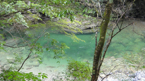昼までは頭上に張り出した梢のおかげでテントは日陰に入っているが、昼を過ぎると太陽が頭上に移動し、テントに直射が当たる。さすがに暑くなってくる。僕は目の前の川で泳ぐことにした。ここは安居川。日本一水がきれいだという仁淀川の支流、水は緑色に透き通っている。「仁淀ブルー」と呼ばれる青い清流。