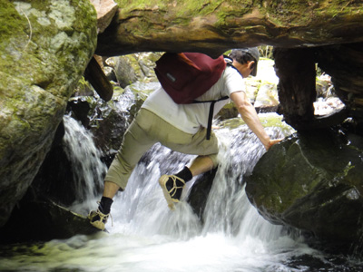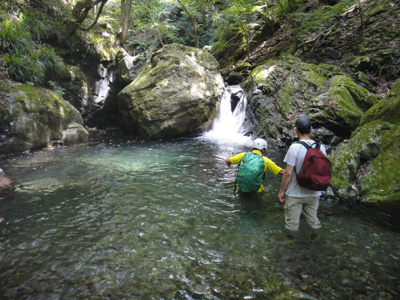 気づくと、撥水シャツが効いている!水に入っても、しばらくすると身体は乾き、全然寒くないのだ!さすがに5250円も払っただけのことはある。メカニズムは、撥水性のシャツが水をシャットアウトし(水中でシャットアウトしているかは微妙)、上に着ているTシャツに水を戻す。Tシャツは水で濡れているのだが、下に着ている撥水シャツは水をカットし、肌には水が接触していない、というわけだ。よって冷たくないので体力が低下することもなく、どんどん次の水に入っていけるという寸法である。金額相応の効果あり、じゃないか、結構結構。これなら完全なる水線遡行が可能だろう。