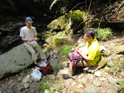 川が二股に分かれるところに挟まったかのように大岩が現れ、右から支沢が流入する。この大岩を過ぎてしばらくしたところの川原で昼飯にする。もう午後2時を過ぎている。遡行を始めて3時間近くたっているが、楽しくて結構夢中で上がってきたので時間が知らず知らずのうちに過ぎた感じだ。