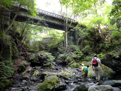30分くらい下っても本流の出合いにぶつからない。そして小さな橋にぶつかってしまう。