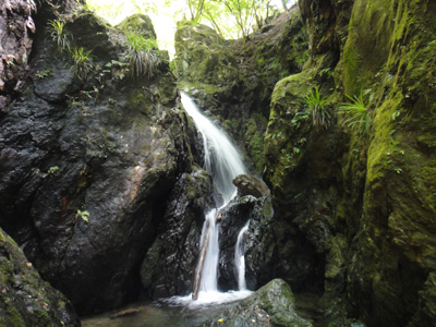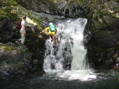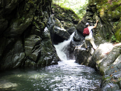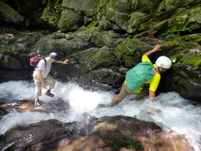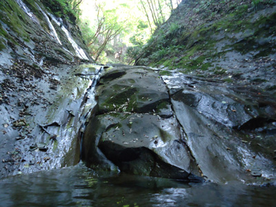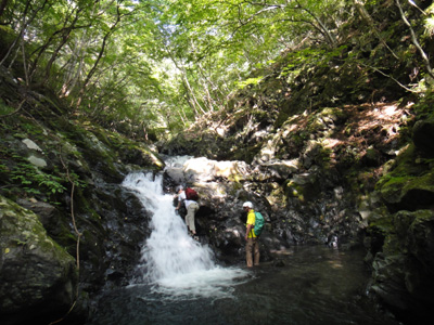 しばらく大岩の間に流れ落ちる川を登っていく。するとゴルジュの先に始めの滝が現れる。2段11m。下段3mをわけなく上がると、上段8mの滝が茶色の岩の上に落ちていて、その跳ね返りの水しぶきをいっぱいに浴びる。この8mがなかなか手強い。流水下の岩は登れそうにないので、滝面の左側の岩場を登る。だがこれが結構キツイ。垂直だし、手がかり、足がかりもいま一つはっきりしたものがない。しかも岩は若干滑る。途中まで上がってちょっときつくなったが、悪戦苦闘の末に執念で何とか上がり切る。足を滑らしたら5mくらい落ちる場所で、無理することはないのだが、どうしてもやっちゃうんだよねぇ。
