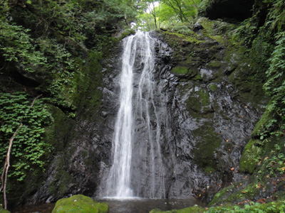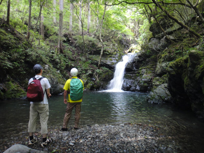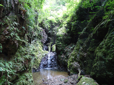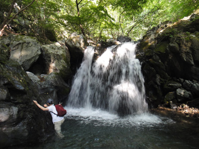 左右の壁に両手両足を突っ張って登るしかないな、と滝を見上げていたが、何と滝の左側の岩に鎖が垂れているではないか。これを使えば登るのは簡単だった。頭の上から落水を浴びる。気持ちいい。これぞ夏の醍醐味。