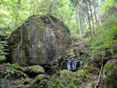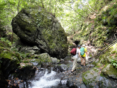 すぐに右側から大きな岩とともに逆川が出合う。今日はこの逆川を遡る。沢登りする人の間ではかなり人気のある沢らしいが、平日11時過ぎなので、人影は全く見えない。谷は深く、晴れてはいるが木々に覆われて陰になっている。