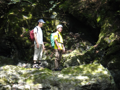 昼食後、着替え。今日は新たなスタイル、水着での遡行を試す(笑)。なぜか。先月福岡県の恐淵谷で、釜が深いために水に入らずに、軟弱にも巻いてしまった苦い思い出が忘れられないからだ(詳しくは九州旅行記で)。ガンガン水の中を行くスタイルでないとダメだと悟ったわけである。上はポロシャツ、下は水着。これならいくら水をかぶっても水に入っても問題ない。水着は半ズボンだが、今日は道なき道を行く薮こぎはないので問題ないはずだ。