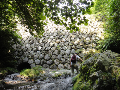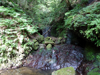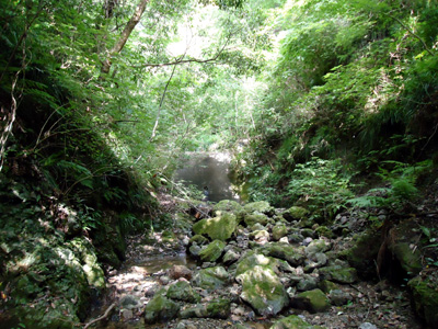 前惣引きの滝は落差9m。斜度も急でなく、足場もありそうなので簡単に登れそうだが、今日は本流の滝を登るのが主目的なので滝の前まで来たところで逆の下流に進む。川原は石の川原で、割と大きな石が多く、いわゆるゴーロだ。水の流れは細い。途中両岸が崖のようになっていたり、林道側が人口の護岸となっていたりで、暗くて細い渓が続く。これといった特徴もなく、水量が少なくて暗いので、沢歩きの爽快感がない。