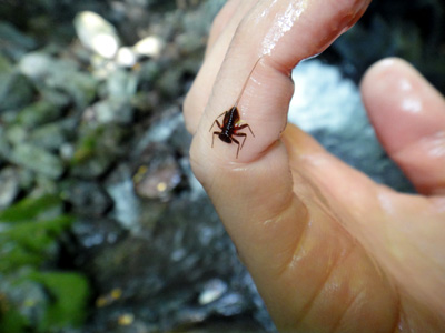 川虫は相変わらず手にどんどん付着してくる。これも面白いもので、常に水に入っている足にはあまり付かずに、手に付く。水中の岩の上に手を突いたときに乗り移るのだろうか。それにしてもこの、カゲロウの幼虫だろうか、楕円形の頭がハンマーのようで実に愛嬌がある。