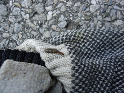 緑色の小さくて細い尺取虫(長さ1.5cmほど)が肌の上を這っていた。僕は本能的にすぐこやつを振り落としてしまったが、もっと良く観察すればよかった。実のところ肌の上で尺を取っていたので、パッと見でヒルかと思ったのだ。緑色なので違うと分かったのだが、手の動きは止まらなかった。落とした先を探してみたが見つからず。
