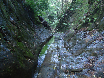 岩溝上に足を置き、慎重に横歩きする。手のホールドに苦心する。手でつかめるような岩のでっぱりがないし、滝面の岩は苔でヌルヌルと滑る。ジリジリとトラバースし、草が生えているところに到達。草を越えてその先の斜面に立たねばならないが、この草を越えるのが難しい。滝壺に落ちる気なら大胆なこともできるが、丸腰なので結局ここで断念。次に来るときは仲間とヘルメットをかぶってこよう。この草を越えるには準備が必要だ。