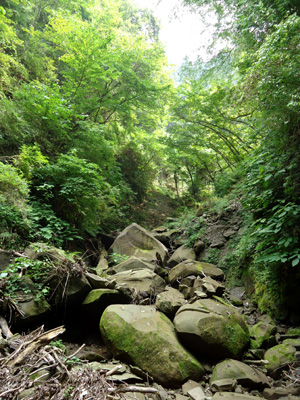 平久里川の本流に入り、石を乗り越えていく。水がほとんど流れていない。さらに、沢は倒木と土砂や石で完全に塞がれてしまっている。