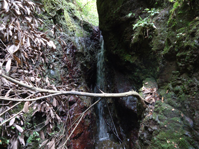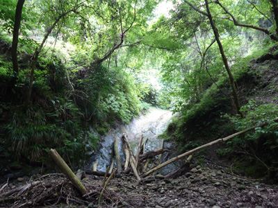 巻き道も厳しそうなので、この倒木の中に突っ込んでいく。ほとんど薮漕ぎだ。今日は薮漕ぎはなかったはずなのに。くもの巣に次々に突っ込む。あまりにもくもの巣が多いので、途中から木の枝を目の前で振り回しながら進む。そんな場所をいくつか越すと、水が涸れてしまった。