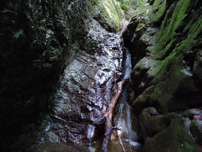 大ダワ沢が左岸から5mの滝をかけて流入する。本流を進み、2段11mのナメ滝を越えると、支沢が流入しているところに、7mトイ状の滝が岩の間を滑り落ちている。その名の通り、雨どいのように細くえぐれた岩の間をかなりの勢いで細い水流が落ちる。左右の岩壁に両手両足を突っ張って登るが、結構ツルツルしたすべすべ岩なので若干ビビる。何しろ、突っ張りの場合は足を滑らしたら結構怖い。