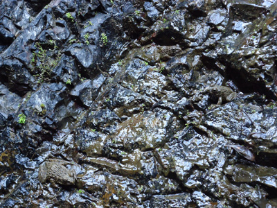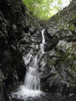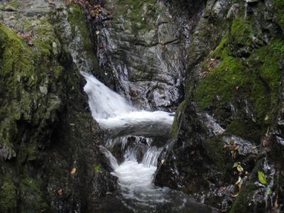 山水画のような風景。黒い岩のナメを、白い筋が落ち、脇を固めるのは緑色に苔むした川原の岩々。