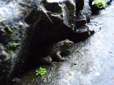 この沢では巨大なカエルが多い。ウシガエルというのかヒキガエルなのか、とにかくイボイボの茶色の巨体がそこかしこの岩の上でじっとしている。大物は20cm級だ。彼らはあまり動かない。僕を見て逃げるものもいるが、逃げないでじっと動かないものが多い。さながら岩の上で水を浴びながら瞑想する僧のようである。カエル坊主か。あるときは岩に手をかけて登っていくと、手を置いた岩の上にカエルがいて、気づかずに危うく手で押しつぶしそうになってしまった。もちろん僕はブヨブヨした感覚に死ぬほど驚いたが、当のカエルの方は僕に手で押しつぶされそうになってもまだ動かないのだ。根性すわっているというのか何というのか。