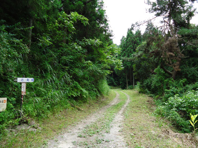 林道を10分くらい上がると、坊滝への分岐道となり、この先は車両通行禁止となっていたので、ここのちょっとした平地に車を寄せて止める。結構山を登ってきたが、それほど鬱蒼とした山とは感じない。空では真夏の太陽が雲に見え隠れしている。