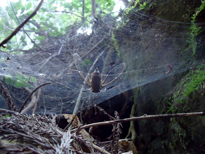 苔むした石の川原を遡る。枯れ枝に無数のくもが巣を張っている。