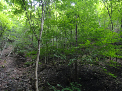 熊らしき動物の声がした辺りの森の斜面。この下が遡行した逆川 |