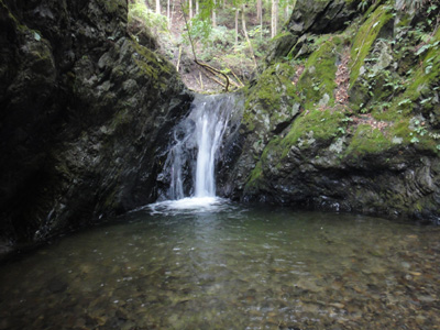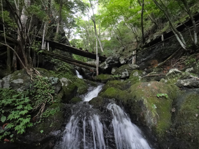 滝を登りきったのが16:15。滝の落ち口のすぐ上に、木橋がかかっている。これがウスバ林道だ。林道というよりも、登山道。これを南方向に下っていけば、青梅線の鳩ノ巣駅まで1時間10分ほどだという。さらに逆川は上流に続いている。大きな岩が重なり、そこから水の筋が落ちている。この先、さらに源流まで詰めれば、尾根には割と簡単に出られるようである。時間があればその尾根を川乗山まで登ってもいいのだが、今日は入渓時間も遅かったし、もともとここで遡行終了予定だった。