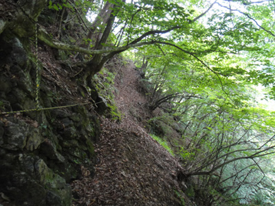 ほとんどただの斜面にしか見えない登山道。ロープあり。 |