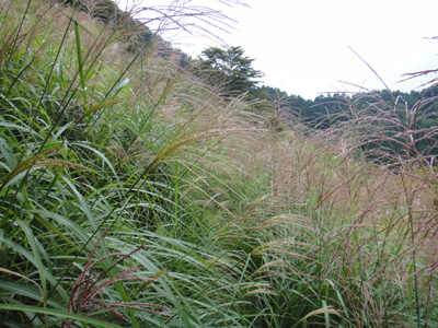 このススキの道はしばらく続いた。手でかき分けて進む。まさに薮漕ぎ状態。ようやくススキ地帯が終わり、普通の道になる。とまたまた今度は道を横切って動物がすごい速さで右下の斜面に降りていった。僕は腰が抜けそうなくらい驚いたが、よく見るとそれは鹿だった。