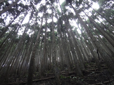 植林帯が続く。等間隔に植えられた杉、ヒノキの森を歩く。伐採された木が斜面に並べられている。基本、ずっと下り坂。麓まで降りるだけだ。