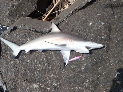 後で調べたところ、ヒレの縁が黒い特徴があるので、カマストガリザメ、というサメのようだ。