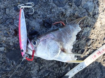 ルアーにかかったニベが胴体を何者かに食いちぎられた |