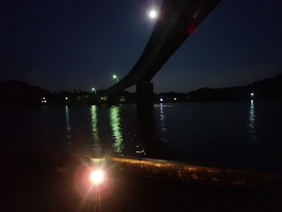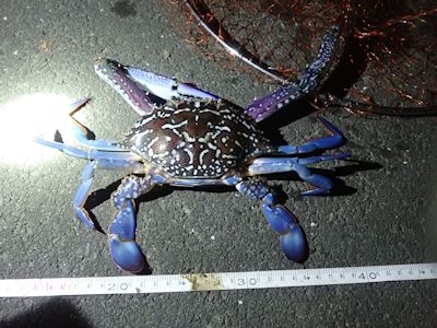 しかし、22時過ぎまで釣って、釣れたのは大きなカニ1匹。重いだけで全然引かないので、何だろうと思ったらカニだった。甲は茶色に白い筋の入ったちょっと派手な模様で、紫色の足で、長いハサミを持っている。河口部にこんなでかいカニがいるのね。リリース。