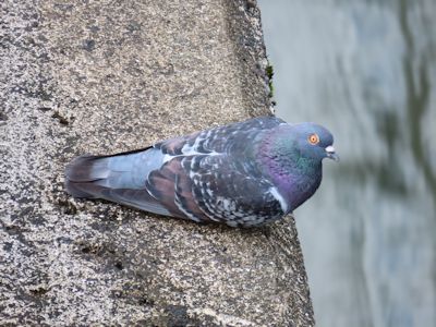 ダムの堤体にいる私が上から下のドバトを撮った。