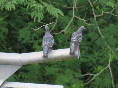 2羽のハトたちは、このトンネルと近くの森をずっと往復して、巣の素材を運んでいるようだ。