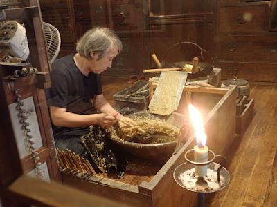 ろうそく店で、ろうそく作りの実演 |