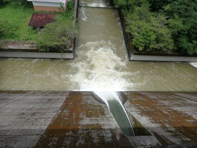 瓜田ダムの堤体から下を見下ろす。水が勢いよく放水されている