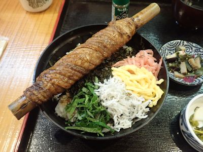 宇和島名物、太刀魚棒丼。太刀魚の蒲焼が竹に巻かれている |