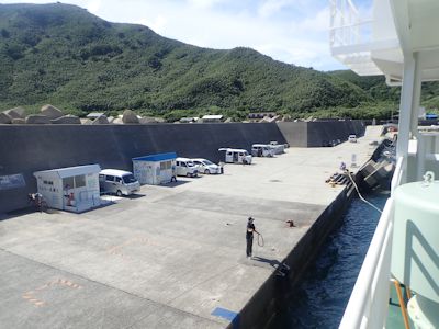 フェリー太陽Uは口永良部港へ入港。民宿の迎えの車が来ているはず