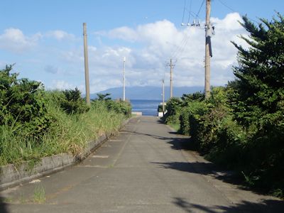 道の突き当りが湯向港で、その先に屋久島が浮かぶ