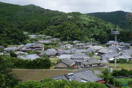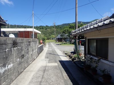 湯向地区のメインストリート。両側に家が5軒ほど。