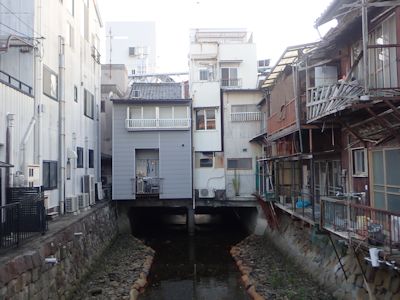 水路の周りに建つ家々。ベランダが壊れている家もある