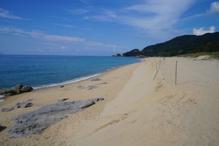 永田いなか浜。ウミガメ産卵日本一と称している。右のエリアが産卵