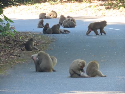 西部林道では、サルが道を占拠している (鹿児島県屋久島)